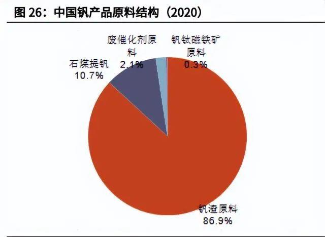 原料及工藝:國際以釩鈦磁鐵礦為主,國內(nèi)以釩渣為主 。釩的地殼豐度雖然較高,但卻主要與其他礦物形成共生礦或者復(fù)合礦,獨(dú)立 釩礦較少見。目前世界上發(fā)現(xiàn)的含釩礦物有 70 多種,釩礦主要有以下三種:(1)釩鈦磁鐵礦:釩鈦磁鐵礦中的釩主要以 FeO·V2O3 尖晶石形態(tài)存在, 礦中含釩 0.2%~1.5%。除美國外,主要產(chǎn)釩國家都是從釩鈦磁鐵礦中提取釩。(2)鉀釩鈾礦:鉀釩鈾礦是一種鉀鈾的釩酸絡(luò)鹽,它的化學(xué)式為 K2O·2UO3·V2O5·1~3H2O,呈淺黃色或淺綠黃色,其中五氧化二釩含量可達(dá) 20.16%,美國是這種礦物的主要產(chǎn)地。(3)石油伴生礦:石油伴生礦寄生在原油中,主要分布于南美洲。據(jù)吳優(yōu)等人發(fā)布的《2020 年全球釩工業(yè)發(fā)展報(bào)告》,世界釩產(chǎn)品原料的絕 大部分均來自于釩鈦磁鐵礦,大多數(shù)國家都是通過釩鈦磁鐵礦在煉鋼的時(shí)候,從 含釩鋼渣中繼續(xù)提煉釩,包括中國、俄羅斯等,而美國主要從石油渣、煤灰、廢 催化劑等中提煉。2020 年全球約 74.8%的釩來自于釩鈦磁鐵礦經(jīng)鋼鐵冶煉后得到的富釩鋼渣,直接從釩鈦磁鐵礦提取釩的占比 13.8%,11%由回收的含釩副 產(chǎn)品(含釩燃油灰渣、廢化學(xué)催化劑等)及含釩石煤提取。