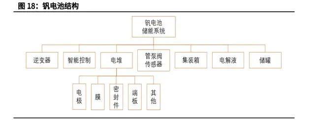 整個(gè)釩電池儲能系統(tǒng)主要由電堆、電解液、逆變器、智能控制、儲罐、集裝 箱、管泵閥傳感器幾部分構(gòu)成。釩電池最主要的核心部件就是電堆和電解液,其 中電解液的成分一般為五氧化二釩,也是整個(gè)釩電池系統(tǒng)中釩產(chǎn)品的主要用途。