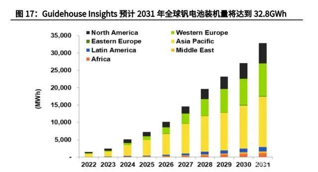 Guidehouse Insights 于 2022 年二季度發(fā)布的《Vanadium Redox Flow Batteries :Identifyting Market Opportunities and Enablers》報(bào)告顯示, 2022-2031 年釩電池年裝機(jī)量有望保持 41%的復(fù)合增長率,預(yù)計(jì) 2031 年全球釩電池年裝機(jī)量將達(dá)到 32.8GWh;其中,2031年亞太地區(qū)(主要為中國)年裝機(jī) 量將達(dá)到約 14.5GWh,北美地區(qū)將達(dá)到 5.8GWh,西歐地區(qū)將達(dá)到 9.3GWh。