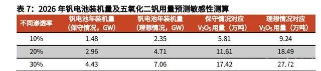 按照保守、理想兩種場景和釩電池在新型儲能中 10%、20%、30%的滲透率測算,2026 年釩電池年裝機(jī)量的范圍是 1.48GW-7.06GW。取中值 20%計(jì)算, 保守和理想兩種情形下,年裝機(jī)量分別為 2.96GW 和 4.71GW,按照單 GWh 電 池消耗 5500 噸釩(折五氧化二釩 9821.4 噸)估算,2026 年對五氧化二釩的需 求拉動約 11.61 萬噸和 18.49 萬噸(假設(shè) 4 小時(shí)儲能時(shí)長),2021 年中國金屬釩產(chǎn)量折五氧化二釩產(chǎn)量約 13.1 萬噸。若釩資源后續(xù)開發(fā)力度不及 預(yù)期,或?qū)︹C價(jià)有明顯的拉動,進(jìn)而影響釩電池電解液成本。