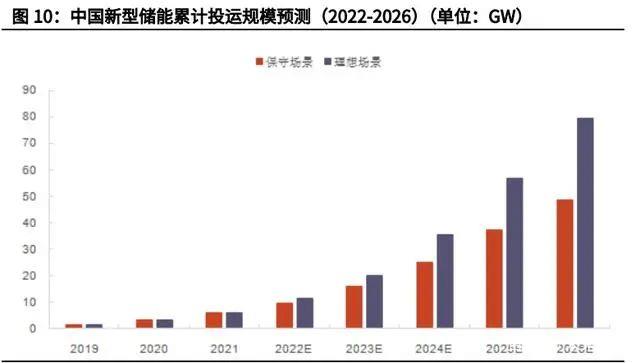 預(yù)計(jì) 2026年我國新型儲能累計(jì)裝機(jī)規(guī)模達(dá)到 48.5GW 和 79.5GW(分別為 保守和理想情況)。據(jù)數(shù)據(jù)統(tǒng)計(jì), 2021年我國新型儲能累計(jì)裝機(jī)規(guī)模為 5.73GW。據(jù) CNESA 的預(yù)測,在保守場景下,到 2026年新型儲能累計(jì)規(guī)模達(dá)到 48.5GW,2021-2026 年的復(fù)合年均增長率為 53.3%;理想場景下,累計(jì)裝機(jī)將 達(dá)到 79.5GW,2021-2026 年的復(fù)合年均增長率為 69.2%。