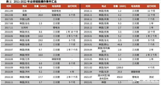 由于鋰離子電池的能量密度占優(yōu)以及成本的不斷下降,近幾年鋰電池在儲能 領(lǐng)域迅速推廣,但與此同時(shí),鋰電池儲能爆炸的事故也在增加。根據(jù)我們的統(tǒng)計(jì), 2011-2022 年 4 月全球共計(jì)發(fā)生 34 起儲能電站爆炸事件,其中,日本 1 起、比 利時(shí) 1 起、中國 3 起、美國 4 起、韓國 25 起。從爆炸的電池類型來看,仍以鋰電池為主,合計(jì) 32 起,占比 94%,剩余為美國 1起鉛酸電池,日本 1起鈉硫電池;而 2017年以來的儲能爆炸事件均為鋰電池爆炸。