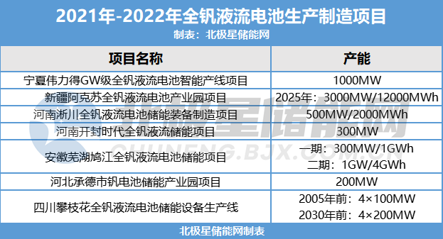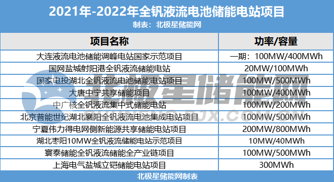 根據(jù)電極活性物質(zhì)的不同,液流電池可分為全釩液流電池、鐵-鉻液流電池、鋅溴液流電池等,其中全釩液流電池發(fā)展最快,商業(yè)化程度最高。其中,全釩液流電池的價格隨著產(chǎn)業(yè)的發(fā)展在不斷變化。在2019年以前,因下游需求小、生產(chǎn)規(guī)模不大、產(chǎn)業(yè)配套不成熟等問題,全釩液流電池單瓦時價格高達(dá)4元以上。雖然全釩液流電池曾因造價較高發(fā)展受阻,但是隨著我國對儲能市場的開發(fā)以及釩價格的下降,2021年開始全釩液流電池示范項目集中出現(xiàn)。據(jù)不完全統(tǒng)計,2021年3月至2022年5月,國內(nèi)共有10個正在規(guī)劃或建設(shè)的全釩液流電池儲能項目,總規(guī)模約3.74GWh,詳情如下: