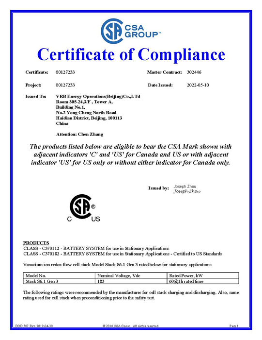 CSA集團(tuán)中國(guó)區(qū)副總裁葛延青女士說,“CSA集團(tuán)對(duì)北京普能第三代電堆產(chǎn)品獲得ANSI/CAN/UL 1973認(rèn)證證書表示祝賀。普能產(chǎn)品獲得認(rèn)證,標(biāo)志著其全釩液流技術(shù)的核心電堆在安全性方面的優(yōu)異表現(xiàn)。我們希望北京普能通過獲得像CSA這樣權(quán)威機(jī)構(gòu)對(duì)其產(chǎn)品的認(rèn)證,可以讓國(guó)內(nèi)外客戶更有信心選擇其全釩液流儲(chǔ)能產(chǎn)品”。