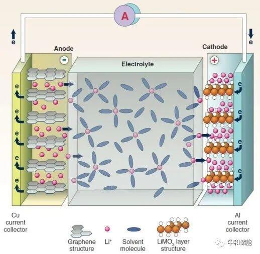如下圖所示(以LiMO2[2]為例),鋰離子電池的工作原理可以概括為鋰離子在正負(fù)極之間的穿梭并進(jìn)行嵌入脫出的充放電過程。充電時(shí),鋰離子從正極材料晶格脫出,經(jīng)過電解液到達(dá)負(fù)極材料并嵌入其晶格之中;而在放電時(shí),又是負(fù)極材料中的鋰離子脫嵌后,經(jīng)過電解液重新嵌入正極材料,這種可逆的嵌入和脫嵌過程構(gòu)成了鋰離子電池的充放電過程。