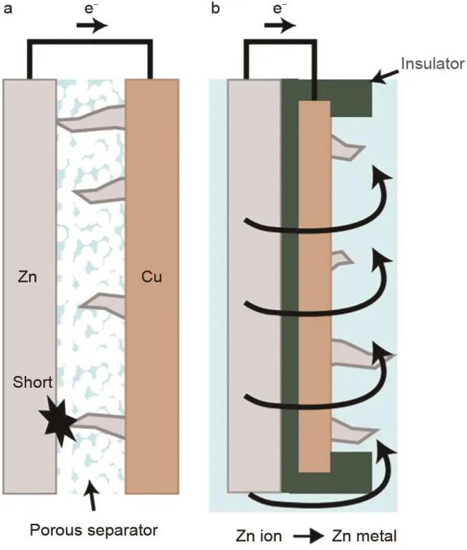 鋅枝晶主要形成于電池充電過(guò)程中。鋅枝晶的存在容易導(dǎo)致電池庫(kù)侖效率和容量降低、電池壽命縮短等問(wèn)題,嚴(yán)重者會(huì)刺穿隔膜,造成電池短路。