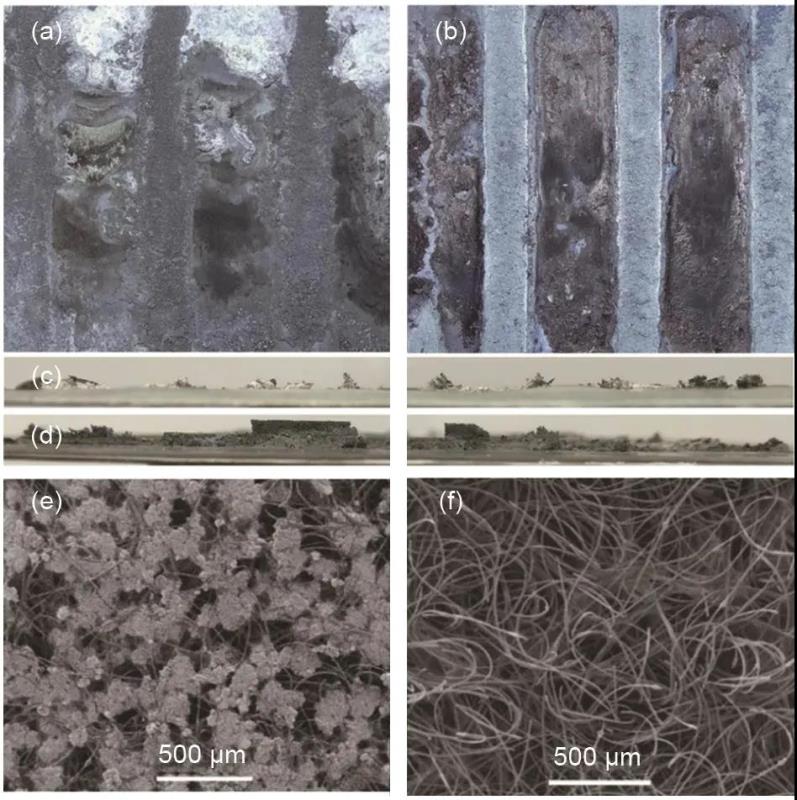 圖11 堿性鋅鐵液流電池中,使用鋅板作為電極,充電 (a)、放電 (b) 后電極俯視圖,充電 (c)、放電 (d) 后的電極側(cè)視圖;使用三維多孔碳?xì)肿鳛殡姌O,充電 (e)、放電 (f) 后的電極形貌圖
