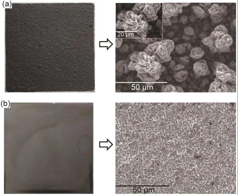 圖10 鋅沉積形貌圖:(a) 靜止電解液;(b) 流動(dòng)電解液