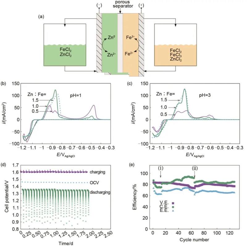 為了解決Zn/Fe離子在充電/放電過(guò)程中出現(xiàn)的交叉污染現(xiàn)象,Selverston等研究了在弱酸性電解液中,使用混合金屬離子(Zn2+、Fe2+/Fe3+)的鋅鐵液流電池的可行性,如圖5所示。在負(fù)極側(cè),作者考察了pH值、Zn/Fe摩爾比、鋅傳質(zhì)對(duì)鐵沉積和溶出行為的影響,實(shí)驗(yàn)結(jié)果表明,只有在較低的Zn/Fe摩爾比下才會(huì)發(fā)生鐵的溶出現(xiàn)象,而pH=1和pH=3對(duì)于實(shí)驗(yàn)結(jié)果并沒(méi)有明顯的影響,在負(fù)極上的鋅沉積和剝離過(guò)程近似于正常的鋅電極。而在正極側(cè),鋅離子的存在對(duì)Fe2+/Fe3+的電化學(xué)反應(yīng)沒(méi)有顯著影響。因此,通過(guò)使用混合的Zn-Fe電解液可以提高電池對(duì)鋅鐵離子交叉污染的耐受度,以多孔膜來(lái)代替昂貴的離子交換膜,同時(shí)還可以降低成本。該電池連續(xù)運(yùn)行了10天、100個(gè)循環(huán),開(kāi)路電壓保持在1.5 V,作者認(rèn)為在未來(lái)探究電解液中鐵的配體以及優(yōu)化溶液的組成將是重要的研究方向。