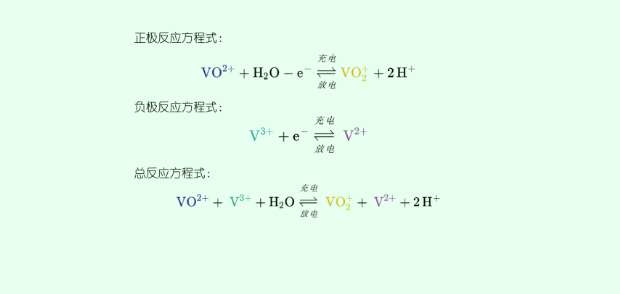 在全釩液流電池中,不同價(jià)態(tài)的釩離子儲(chǔ)存在正負(fù)極儲(chǔ)罐的電解液中,利用循環(huán)泵讓電解液在對(duì)應(yīng)的電極與儲(chǔ)液罐中循環(huán)流動(dòng),并使用離子傳導(dǎo)膜將正負(fù)極隔開(kāi),利用正極發(fā)生的四價(jià)和五價(jià)釩離子的氧化還原反應(yīng)和負(fù)極發(fā)生的二價(jià)與三價(jià)釩離子的氧化還原反應(yīng)實(shí)現(xiàn)化學(xué)能和電能的相互轉(zhuǎn)換。