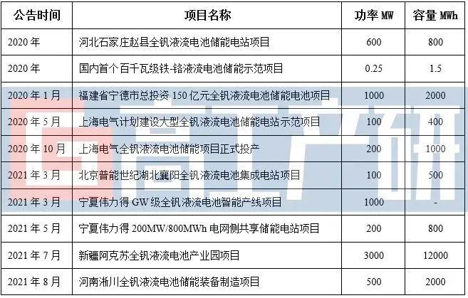 2021年國內主要液流電池產業(yè)鏈擴產項目(部分)
