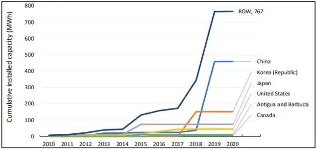 2010-2020年全球液流電池裝機量增長情況(MWh)