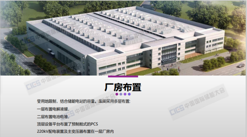 這張圖是這個電站的效果圖,實(shí)際建設(shè)的情況和它也相差不多,受到用地限制,因?yàn)槭浅鞘兄行碾娬?,用地是征地來的。所以我們采用了多層布置,一層布置電解液的液罐,二層布置液堆,在頂層設(shè)計了一個高的高鐵臺,用來布置PCS的集裝箱預(yù)制艙。220KV配電裝置和變壓器布置在一層廠房內(nèi),實(shí)現(xiàn)了和周邊環(huán)境的一致性。