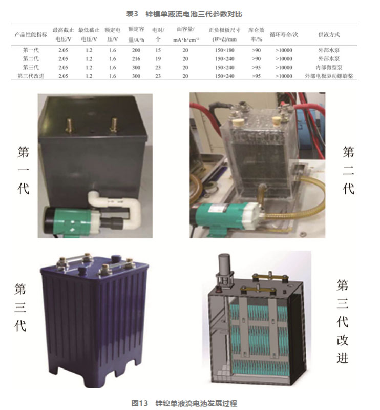 鋅鎳單液流電池已經(jīng)經(jīng)過(guò)了基礎(chǔ)技術(shù)研究、原理驗(yàn)證、小規(guī)模中試等階段,實(shí)驗(yàn)室原理電池循環(huán)壽命可以超過(guò)一萬(wàn)次。目前,單液流鋅鎳電池已經(jīng)研發(fā)出了三代規(guī)模化產(chǎn)品。第一代鋅鎳單液流電池在國(guó)家電網(wǎng)公司和國(guó)內(nèi)的兩所大學(xué)里面進(jìn)行了初步演示與應(yīng)用,結(jié)果發(fā)現(xiàn)該電池運(yùn)行效果良好,具有繼續(xù)開(kāi)發(fā)的潛力,且浙江裕源儲(chǔ)能科技有限公司已經(jīng)開(kāi)始生產(chǎn)。第二代產(chǎn)品的生產(chǎn)線基本完成,儲(chǔ)能規(guī)模已經(jīng)達(dá)到1 MW·h。我國(guó)張北國(guó)家風(fēng)光儲(chǔ)能示范區(qū)搭建了存儲(chǔ)容量為50 KW·h的單液流鋅鎳電池儲(chǔ)能系統(tǒng),由168個(gè)200 A·h 的單體電池串聯(lián)而成,能量效率可達(dá)80%。第三代產(chǎn)品300 A·h的電池正在優(yōu)化改進(jìn)階段,具有很好的應(yīng)用前景。表3是三代產(chǎn)品及改進(jìn)產(chǎn)品的性能參數(shù)。三代產(chǎn)品依次在容量上有所提升,圖13展示了實(shí)物圖。