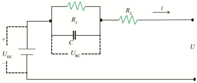 構(gòu)建能夠準(zhǔn)確描述電池在充放電過(guò)程中內(nèi)部變化情況以及預(yù)測(cè)外部特性的系統(tǒng)模型可以加快鋅鎳單液流電池的工程化應(yīng)用進(jìn)度。目前來(lái)講,從精度(越高越好)和計(jì)算量(越小越好)來(lái)講,等效電路二階模型用于鋅鎳單液流電池是較合適的:用電路元件來(lái)表示電池內(nèi)部的化學(xué)反應(yīng)過(guò)程,用并聯(lián)電容和電阻表示電池的極化,用串聯(lián)電阻表述歐姆內(nèi)阻,各個(gè)參數(shù)之間通過(guò)電路方程式聯(lián)系。圖12展示了單液流鋅鎳電池的等效電路模型示意圖。