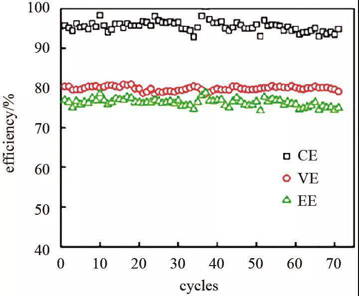 為了降低正極極化,張華民等設(shè)計(jì)了一種具有蛇形流場(chǎng)的電池結(jié)構(gòu),通過(guò)增強(qiáng)質(zhì)量傳輸來(lái)降低正極的極化[見(jiàn)圖10(b)],這種結(jié)構(gòu)可以將電流密度提高至接近80 mA/cm2 。與傳統(tǒng)結(jié)構(gòu)電池相比[見(jiàn)圖10(a)],在80 mA/cm2的電流密度下,蛇形流場(chǎng)結(jié)構(gòu)使得電池的能量效率提高了10.3%,在70次充放電循環(huán)中,效率沒(méi)有明顯下降,如圖11所示。同時(shí)指出,在80 mA/cm2的電流密度下,在0~40 ℃,電池充放電過(guò)程中的正極極化遠(yuǎn)大于負(fù)極極化。正極的嚴(yán)重極化導(dǎo)致電池工作電流密度低,進(jìn)而電池功率密度低且充放電效率不高,所以接下來(lái)迫切需要研究由快速離子、質(zhì)子和電子傳輸途徑組成的高活性氫氧化鎳電極,從而有效降低正極極化。
