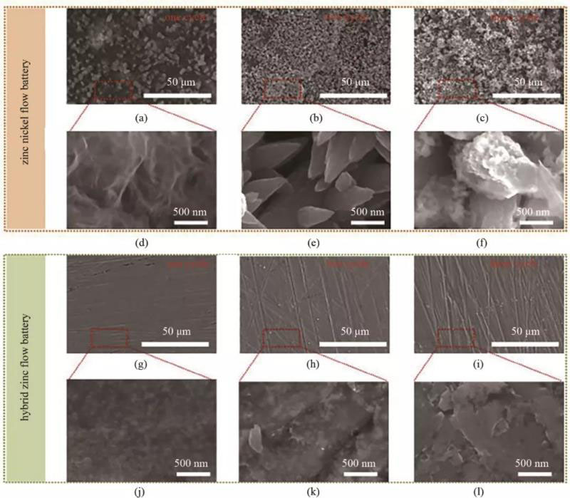 圖8 不同循環(huán)階段陽(yáng)極的形貌:在傳統(tǒng)的鋅鎳液流電池中(a)、(d) 一個(gè)周期后, (b)、(e) 兩個(gè)周期后,(c)、(f) 經(jīng)過(guò)三個(gè)周期后; 復(fù)合鋅鎳液流電池 (g)、(j) 在一個(gè)循環(huán)后,(h)、(k) 經(jīng)過(guò)兩個(gè)循環(huán),(i) 、(l) 經(jīng)過(guò)3個(gè)循環(huán)后