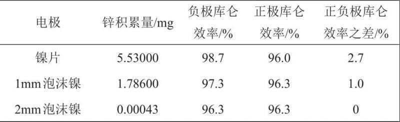與前面提到抑制正極副反應(yīng)的做法類(lèi)似,可以通過(guò)增強(qiáng)負(fù)極的副反應(yīng)來(lái)緩解鋅的積累??梢栽O(shè)計(jì)一種具有良好傳質(zhì)結(jié)構(gòu)和反應(yīng)面大的新型電極來(lái)調(diào)節(jié)負(fù)極副反應(yīng)。張華民等采用的方法是把負(fù)極材料從鎳片換成厚度2 mm的泡沫鎳,由于多孔材料有著高比表面積和良好的傳質(zhì)結(jié)構(gòu),副反應(yīng)消耗的電荷會(huì)隨著電極厚度的增加而增加,效果如圖6所示(電池A的負(fù)電極為鎳片,電池B的負(fù)電極為1 mm泡沫鎳,電池C的負(fù)電極為2 mm泡沫鎳)。結(jié)果如表2所示,負(fù)極材料是鎳片時(shí),副反應(yīng)消耗的電荷為電池容量的1.3%,負(fù)極材料是2 mm厚的泡沫鎳時(shí),副反應(yīng)消耗的電荷是電池容量的3.7% ,副反應(yīng)消耗的電荷占比明顯增大,從而使負(fù)極的庫(kù)侖效率從98.7%下降到96.3%,最終與正極相匹配。將負(fù)極材料由鎳片變?yōu)榕菽嚭?,鋅鎳單液流電池在400次循環(huán)中幾乎沒(méi)有鋅積累。