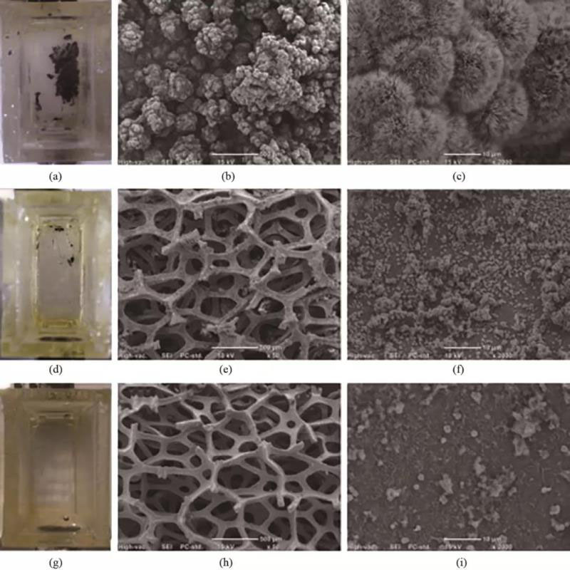 圖6 (a) 電池A、(d) 電池B和(g) 電池C底部的光學(xué)圖像;(b)~(c) 電池A、(e)~(f) 電池B和(h)~(i) 電池C重復(fù)循環(huán)后負(fù)極表面形貌的掃描電鏡