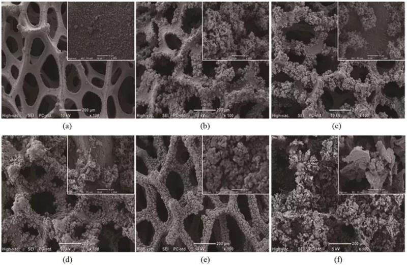 圖4 多孔泡沫鎳在不同電流密度下鋅電沉積形態(tài):(a) 40 mA/cm2; (b) 80 mA/cm2; (c) 120 mA/cm2; (d)160 mA/cm2; (e) 200 mA/cm2; (f) 300 mA/cm2