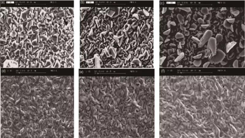 圖3 不同電流密度下沉積鋅在靜止電解質(zhì)中的表面形貌:(a)~(c) (電流密度50、 70、 100 mA/cm2) 和流動(dòng)電解質(zhì)中的表面形貌:(d)~(f) (電流密度50, 70, 100 mA/cm2)