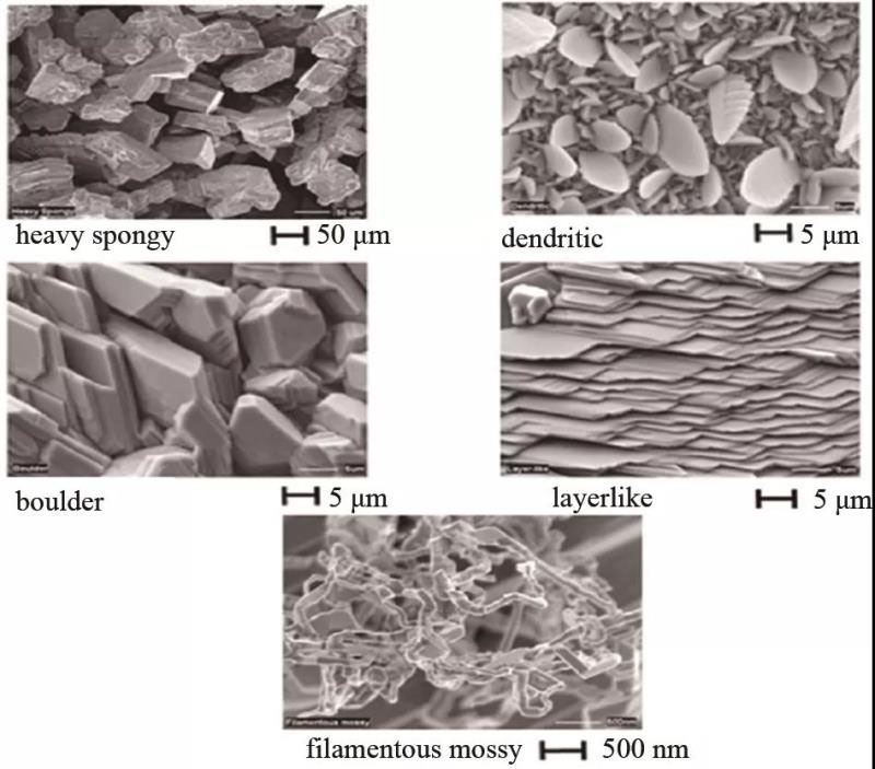 圖2 電沉積鋅在電極表面的形貌(海綿狀; 枝晶狀; 塊狀; 片層狀和苔蘚狀)(通過(guò)堿性電解質(zhì)電沉積)