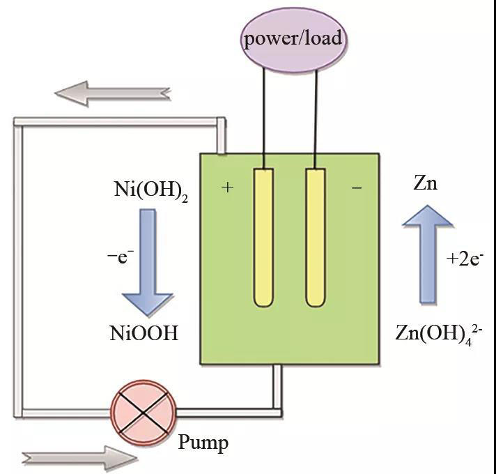 以上化學(xué)方程式表明:充電時(shí),負(fù)極發(fā)生的反應(yīng)是電解質(zhì)中的 Zn(OH)42- 被還原成單質(zhì)Zn沉淀在負(fù)極材料上,正極上的Ni(OH)2被氧化成NiOOH;放電時(shí),負(fù)極板上沉積的鋅單質(zhì)又被氧化成離子狀態(tài)溶解到電解質(zhì)中去,而正極NiOOH被還原成了Ni(OH)2。鋅鎳單液流電池的結(jié)構(gòu)如圖1所示。