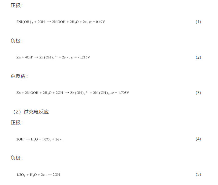 Pletcher等在2004年提出了單液流電池的概念,這種無(wú)膜結(jié)構(gòu)簡(jiǎn)化了電池系統(tǒng),降低了成本。2007年,Cheng等開(kāi)發(fā)出了鋅鎳單液流電池(ZNFB),這種電池具有非常明顯的優(yōu)點(diǎn):①電解液?jiǎn)蝹?cè)循環(huán),消除了溶液的交叉污染問(wèn)題,簡(jiǎn)化了電池系統(tǒng);②不需要使用離子交換膜;③電池材料價(jià)格相對(duì)低廉。工作過(guò)程中,鋅鎳單液流電池一般經(jīng)歷三個(gè)階段:充電、靜置以及放電階段。電池工作中的電極反應(yīng)如下。