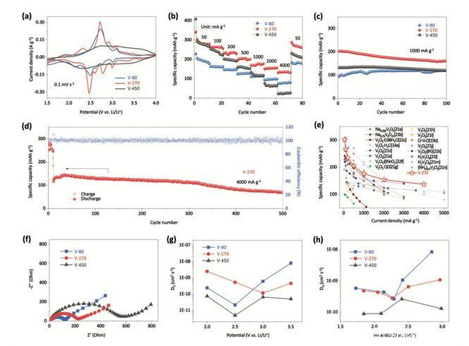 作者認(rèn)為V-270材料倍率性能提升主要是由于熱處理過程中內(nèi)部發(fā)生相變引起的晶粒細(xì)化,從而提升了材料的動力學(xué)特性。從下圖f的EIS圖譜可以看到電荷交換阻抗從小到大的順序為V-80、V-270和V-450,同時作者根據(jù)交流阻抗數(shù)據(jù)計算了Li+在材料中的擴散系數(shù),從下圖g可以看到在2.0和2.5V的范圍內(nèi)V-270材料的Li+擴散系數(shù)都要明顯高于V-80和V-450材料,只有在3.0V和3.5V,V-270材料的擴散系數(shù)才低于V-80材料。同時作者還在1000mA/g的電流密度下采用GITT法對材料的擴散系數(shù)進(jìn)行了測定,從下圖h的測試結(jié)果可以看到,在低電壓下V-270和V-80材料的擴散系數(shù)接近,遠(yuǎn)高于V-450材料,從而使得V-270材料具有了優(yōu)異的倍率性能。
