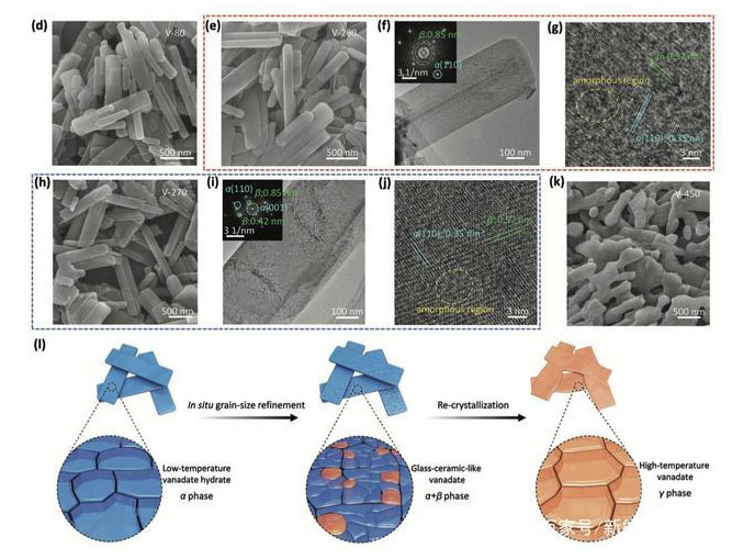 下圖為幾種不同材料的SEM和TEM圖片,從圖中可以看到所有的樣品都呈現(xiàn)了片狀結(jié)構(gòu)(1um長,200nm寬,20nm厚),比表面僅為10-20m2/g,要顯著小于常規(guī)的納米材料。通過高分辨率透射電鏡可以看到V-260和V-270兩種材料內(nèi)部都是呈現(xiàn)出α相和β相兩種混合物相,晶粒尺寸僅為納米級別,同時我們也可以看到材料還存在一些無定形相(玻璃相),表明通過中等溫度的熱處理,成功制備了類玻璃-陶瓷混合相的釩酸鹽材料。