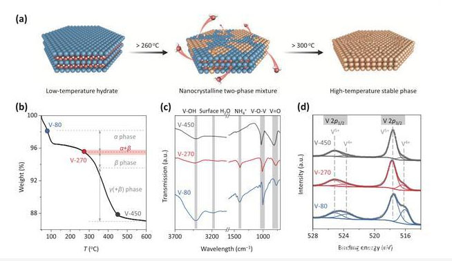 實驗中釩酸鹽正極前驅(qū)體材料是通過兩步水熱法合成,首先將釩酸銨(NH4VO3)與草酸二水化合物(H2C2O4·2H2O)在160℃下水熱反應(yīng)12h,然后再向其中加入LiOH,在180℃下反應(yīng)12h,通過上述的兩步法獲得前驅(qū)體材料還含有大量的自由水,然后在不同的溫度下進(jìn)行熱處理(如下圖所示),通過熱重分析(下圖b)可以看到材料在120℃以下會出現(xiàn)快速的重量損失,主要是材料中的物理吸附水的大量損失,隨后在加熱到250℃這一范圍內(nèi)材料發(fā)生了輕微的重量損失,隨后繼續(xù)升高溫度則開始出現(xiàn)快速的重量損失,這表明材料中結(jié)合的-OH或-NH4發(fā)生分解。