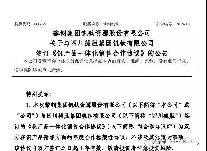 中國(guó)儲(chǔ)能網(wǎng)訊:攀鋼集團(tuán)釩鈦資源股份有限公司關(guān)于與四川德勝集團(tuán)釩鈦有限公司簽訂《釩產(chǎn)品一體化銷售合作協(xié)議》的公告: