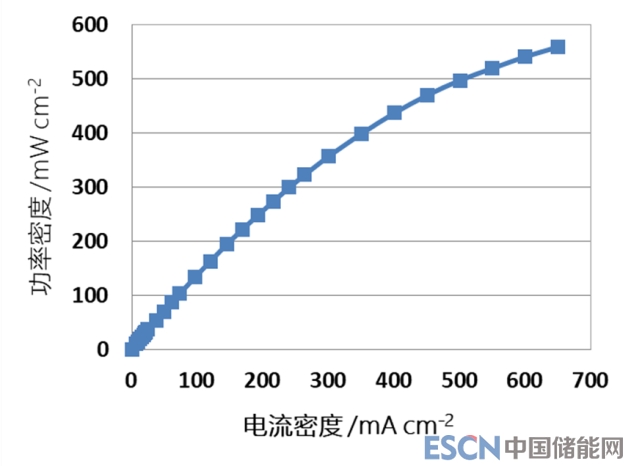 低碳院開發(fā)的高功率密度液流密度液流電池電堆照片及測試結(jié)果。典型的千瓦級液流電池功率密度超過500 mW cm-2,高于同級別傳統(tǒng)液流電池2-3倍,實現(xiàn)電堆的小型化和材料的高效化,具備明顯的低成本優(yōu)勢。