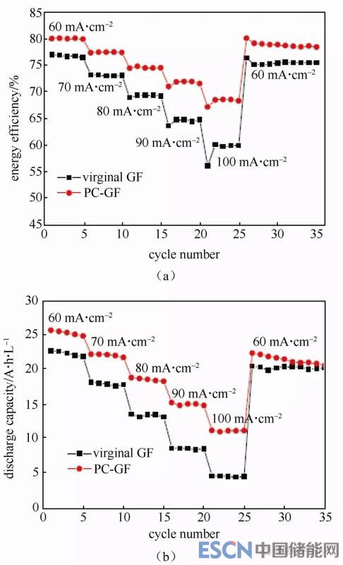 圖6 未修飾的碳氈電極和PC修飾碳氈電極在不同倍率下:(a)能量效率對比曲線;(b)放電容量對比