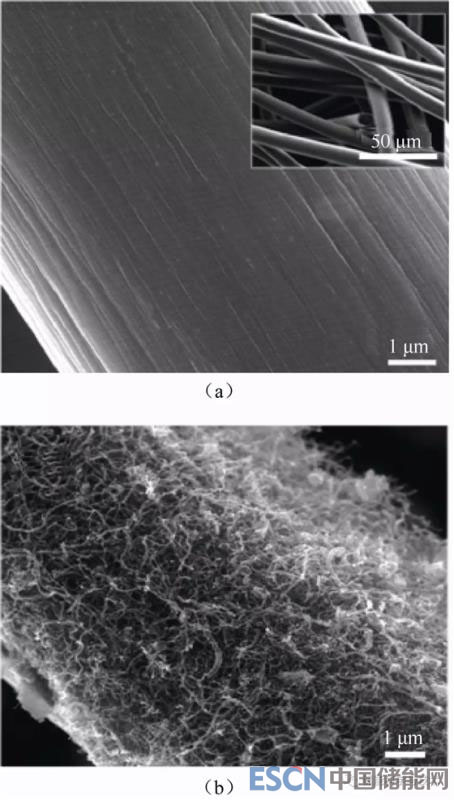 圖2 未修飾碳氈(a)和CF/CNF/CNT復合電極(b)SEM圖