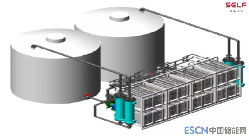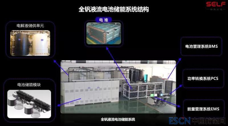 下圖是內(nèi)部的情況。左上角是一個(gè)電堆,幾個(gè)大罐子是電解液罐,里面存的是電解液,還有它的電力控制系統(tǒng)。電池的占地面積跟我們所處的現(xiàn)場大廳差不多大,圖上還展示了電池內(nèi)部的結(jié)構(gòu),里面包括電解液的控制區(qū)、核心的電堆以及電力電子控制區(qū),這是一個(gè)多學(xué)科交叉的領(lǐng)域。