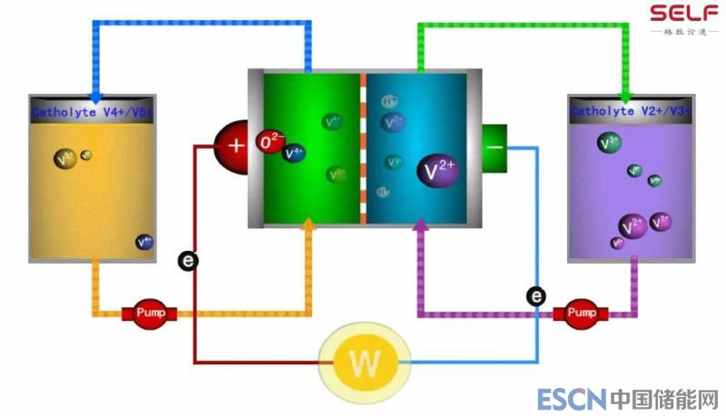裝的是什么?裝的是釩離子的水溶液。釩有4種價(jià)態(tài),2、3、4、5價(jià),通過它們價(jià)態(tài)的變化可以實(shí)現(xiàn)電能和化學(xué)能的轉(zhuǎn)變。大家從示意圖中可以看到,電解液從罐子里流到電池里,然后再回到罐子里,在電池內(nèi)部發(fā)生電化學(xué)反應(yīng),完成充電和放電。釩的4種價(jià)態(tài),分別有紫色、綠色、藍(lán)色、黃色4種顏色,四季分明,是我見過的電池里面最漂亮的一種。