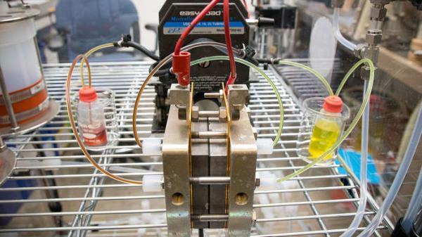 中國儲能網訊:隨著太陽能和風能近年來掀起價格革命,儲能倒成了大問題。人們需要一種大型、廉價而耐用的電池,在日落之后、風停之后提供電力。近日發(fā)表在《焦耳》(Joule)雜志上的一篇論文介紹道,哈佛大學的研究人員利用一種有機“長壽”分子制作出液流電池,儲存的能量可以為整座城市供電。該電池既解決了全釩液流電池的成本問題,又突破了有機液流電池的壽命瓶頸。所謂的液流電池和手機里的鋰電池一樣,都由將電解質中存儲的能量轉換成電能的電極對,以及將電荷從一個電極傳送到另一個電極的電解質組成。不過,傳統(tǒng)電池將電極對和電解質一起封裝,液流電池則將正負電極分開,電解液各自循環(huán)。這些電解液儲存在任意大小的外部容器中,在使用時泵入電極。因此,液流電池的充電容量可以提高到百萬瓦特級別。全釩液流電池是現在主流的一種液流電池,比鋰離子電池更安全,更便宜,更耐用。然而,擔任電解質的釩金屬顆粒比較昂貴,化學家一直試圖用一類名為“醌”的有機化合物作為替代品。使用這類有機物制作電解質,成本僅為全釩液流電池的三分之一,但它們在反復充放電后損耗很快,無法達到工業(yè)界的要求。這是有機液流電池無法商業(yè)化的主要原因。