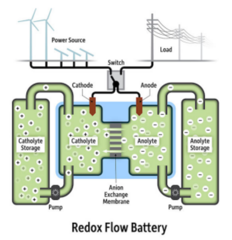 而解決這個(gè)問(wèn)題的辦法可能是采用多余的太陽(yáng)能和風(fēng)能來(lái)儲(chǔ)能的解決方案,如今現(xiàn)在開(kāi)發(fā)一種可以顯著提供儲(chǔ)能能力的化合物,這個(gè)化合物可以在陽(yáng)光和風(fēng)力不足的情況下將多余的電能儲(chǔ)存起來(lái)使用。在將儲(chǔ)能的能源轉(zhuǎn)化成電能時(shí),可以將攜帶相反電荷的化學(xué)溶液泵入固體電極,從而產(chǎn)生電子交換而提供電力。