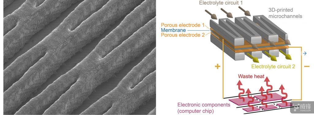 此前的液流電池通常都應(yīng)用在大規(guī)模能量存儲(chǔ)中,例如與風(fēng)電場(chǎng)和太陽能發(fā)電廠組合使用。而把這項(xiàng)技術(shù)用在微型設(shè)備上目前還是首次。新型液流電池的輸出也達(dá)到了新突破,每平方厘米電池表面能產(chǎn)生 1.4 瓦特功率。即使減去將液體電解質(zhì)泵送到電池所需的功率,所得的凈功率密度仍為每平方厘米1瓦特。除此之外研究人員在實(shí)驗(yàn)中發(fā)現(xiàn),電解質(zhì)液體實(shí)際上能夠冷卻芯片。它們散發(fā)的熱量多于電池產(chǎn)生的電能。開發(fā)團(tuán)隊(duì)還使用 3D 打印技術(shù),建立了楔形微通道系統(tǒng)。
