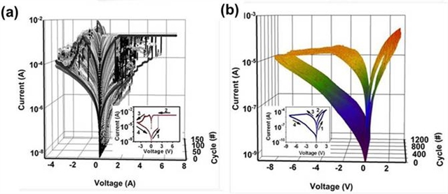 未摻雜(a)與摻雜聚西佛堿(b)電阻轉(zhuǎn)變的循環(huán)操作性能