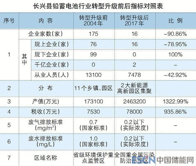 長興縣政府給記者提供的數(shù)據(jù)顯示,轉(zhuǎn)型升級前的2004年,長興鉛蓄電池企業(yè)數(shù)175家,其中規(guī)模以上企業(yè)76家,總產(chǎn)值17.31億元,稅收7500萬元;轉(zhuǎn)型升級后的2017年,長興鉛蓄電池企業(yè)16家,全部是規(guī)模以上企業(yè),總產(chǎn)值246.32億元,稅收7.8億元。2017年與2004年相比,產(chǎn)值增加超過13倍,稅收增長超過9倍。