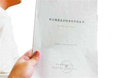 7月11日,在章丘市??德窛贤ㄐ旁O備廠,記者看到了公示的《職業(yè)健康檢查結果報告書》,受檢單位為山東華日電池有限公司,由章丘市疾病預防控制中心于2012年7月4日報送。