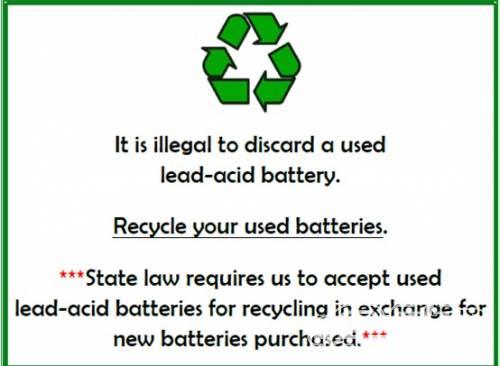 (標(biāo)志內(nèi)容:隨意丟棄廢舊鉛酸電池是違法行為,應(yīng)對鉛酸電池進(jìn)行回收。州法律規(guī)定,消費(fèi)者購買新鉛酸電池時,須用舊電池交換,電池零售商負(fù)責(zé)回收舊電池)