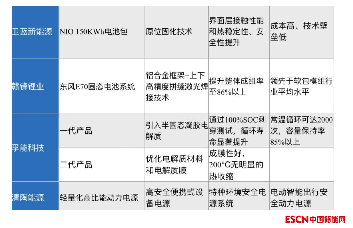 下圖展示了部分半固態(tài)電池開發(fā)商的代表產(chǎn)品及其特點。