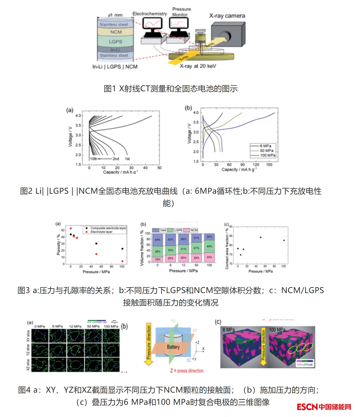 近日豐田公司研究人員及其合作者設(shè)計(jì)具體的實(shí)驗(yàn)利用X射線(xiàn)斷層掃描的方法分析了壓力對(duì)復(fù)合電極形態(tài)結(jié)構(gòu)和全固態(tài)電池(ASSB)電池電化學(xué)性能的影響。結(jié)果發(fā)現(xiàn):(1)增加壓力會(huì)降低電極的孔隙率,有效提高活性材料(AM)與固體電解質(zhì)(SE)之間的接觸面積。降低孔隙率、提升接觸面積會(huì)顯著影響電極的表觀(guān)電導(dǎo)率;(2)AM和SE之間接觸面積的提升使得電極中電荷轉(zhuǎn)移電阻降低了一個(gè)數(shù)量級(jí);(3)外部施加壓力使得電池充電/放電容量有效增加,表明正極材料電化學(xué)活性得到有效提升,根據(jù)實(shí)驗(yàn)數(shù)據(jù)隨壓力增加電池充放電容量呈現(xiàn)出指數(shù)級(jí)別的增加。通過(guò)對(duì)實(shí)驗(yàn)結(jié)果進(jìn)行分析認(rèn)為盡管表觀(guān)電導(dǎo)率的提高和電荷轉(zhuǎn)移電阻的降低,都有利于提升電池的電化學(xué)性能,但電荷轉(zhuǎn)移電阻降低的效果尤為明顯。AM和SE之間的接觸界面略微垂直于施加的壓力。同時(shí)實(shí)驗(yàn)發(fā)現(xiàn)通過(guò)垂直于AM和SE接觸面的方向?qū)嵤毫?,即使外部?shí)施較低的壓力也能達(dá)到較為理想的效果。