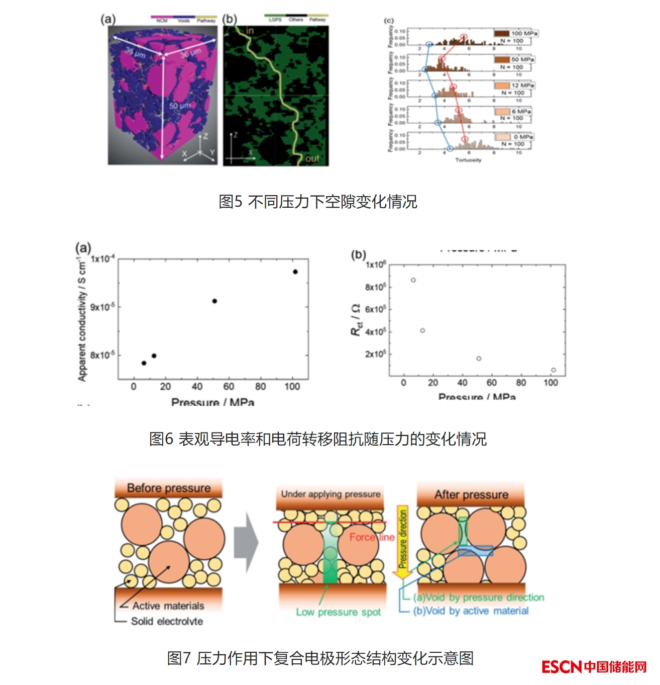 常規(guī)的做法是在電極制造的過(guò)程中施加一定的壓力,來(lái)克服固態(tài)粉末之間的固-固接觸。在電極制造過(guò)程中,盡管施加高壓改善了粉末之間的固-固接觸,但后續(xù)在電池充放電反應(yīng)復(fù)合電極不同材料的體積變化,會(huì)導(dǎo)致活性物質(zhì)和固態(tài)電解質(zhì)之間接觸不良,因此在充放電過(guò)程中同樣需要一定壓力用以克服帶來(lái)的問(wèn)題。根據(jù)相關(guān)文獻(xiàn)一般需要施加的壓力為1MPa,遠(yuǎn)低于電極制造過(guò)程中的百M(fèi)Pa,壓力參數(shù)直接影響復(fù)合電極中的空隙率,并改變表觀(guān)離子電導(dǎo)率。