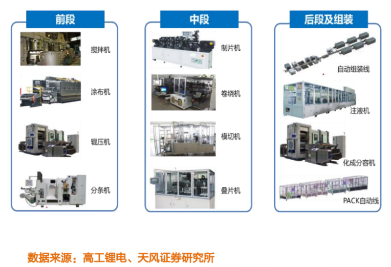 制造過(guò)程按順序可分為前段、中段、后段三個(gè)環(huán)節(jié)。簡(jiǎn)單來(lái)講,前段就是正負(fù)極生產(chǎn)的過(guò)程,后段則是檢測(cè)組裝的環(huán)節(jié)。