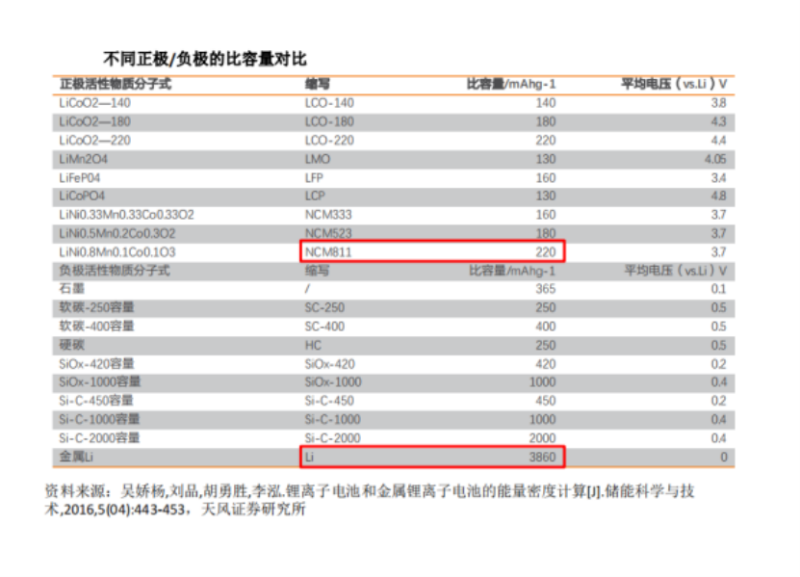 比(克)容量的意義是每克鋰電池材料含多少mAh(毫安時(shí))電量。從液態(tài)鋰電的正負(fù)極材料來(lái)看,負(fù)極石墨365m A·h/g,8系三元高鎳正極220mA·h/g。現(xiàn)有正負(fù)極材料的比容量難以大幅提升。