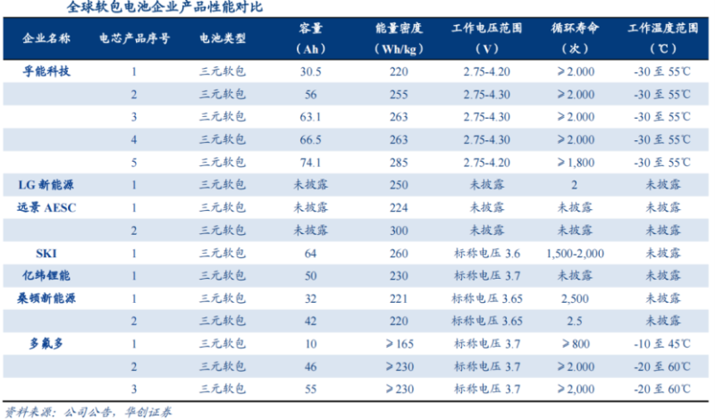 在液態(tài)電池領(lǐng)域,三元軟包是能量密度最高的技術(shù)。根據(jù)2021年4月的《自愿性披露新技術(shù)研發(fā)進(jìn)展公告》,孚能科技研發(fā)成功的新一代動(dòng)力電池,能量密度可達(dá)330Wh/kg,而其余廠家正在努力突破300Wh/kg。